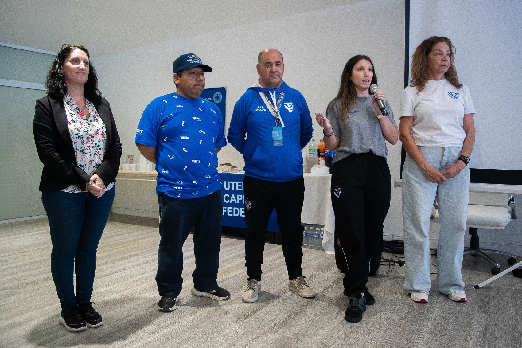 La directiva a cargo de Vélez Género Cynthia Conforto, junto los delegados Pedro Príncipe, Javier Etcheverrito, Laura Galarza y quien lleva la palabra, Alexa Guerrero.